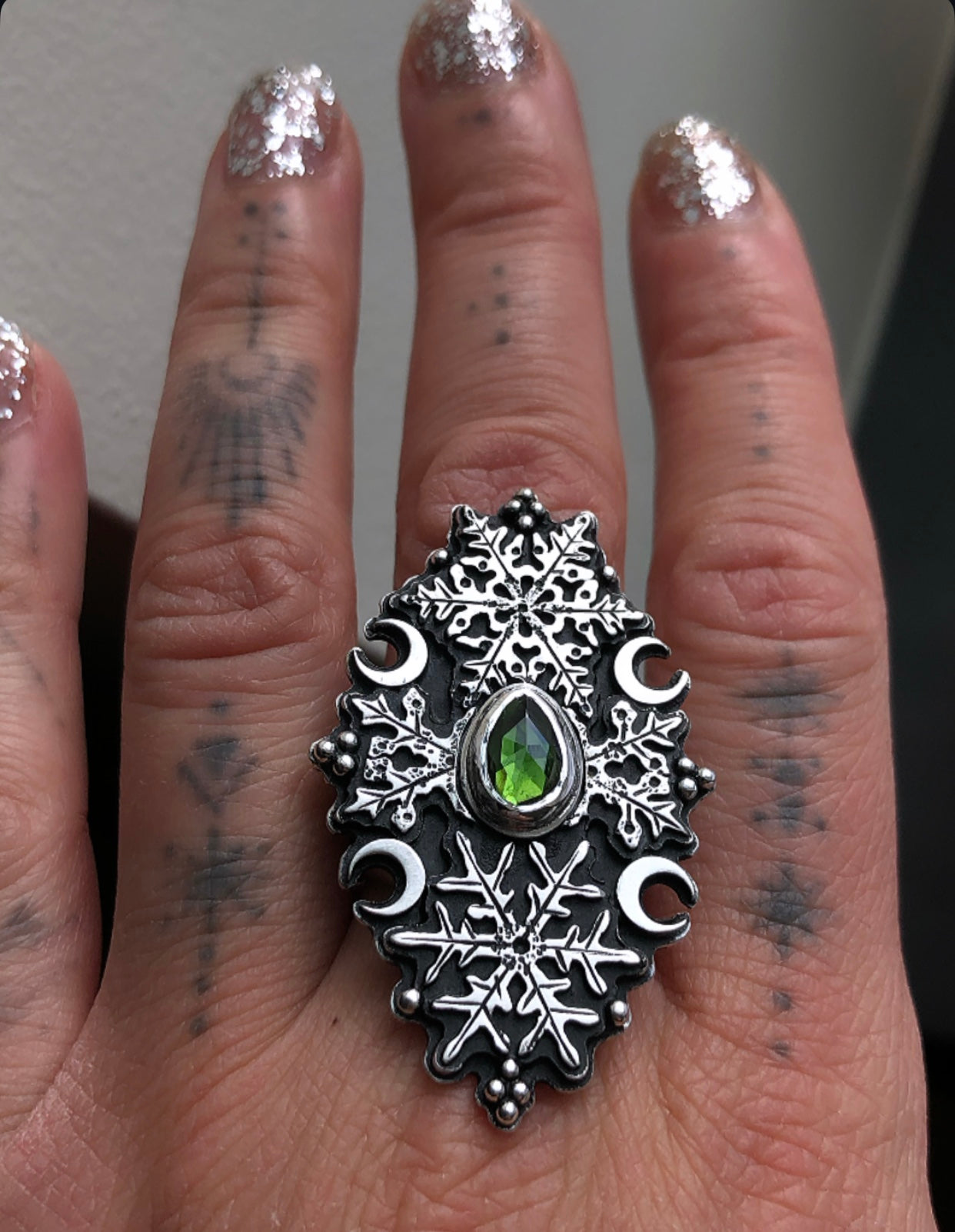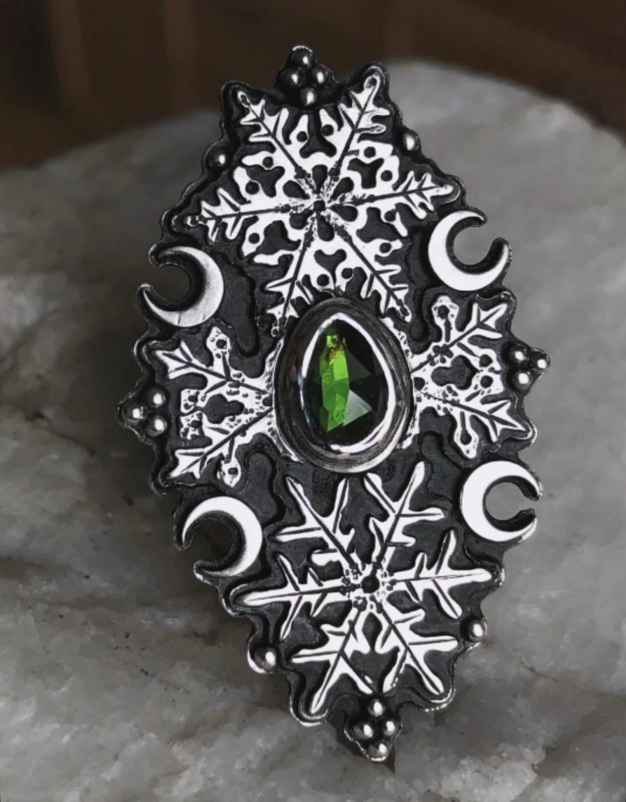 Handcrafted from Sterling and fine silver, an ornate arrangement of snowflakes and crescent moons surround a bright green tourmaline❄️