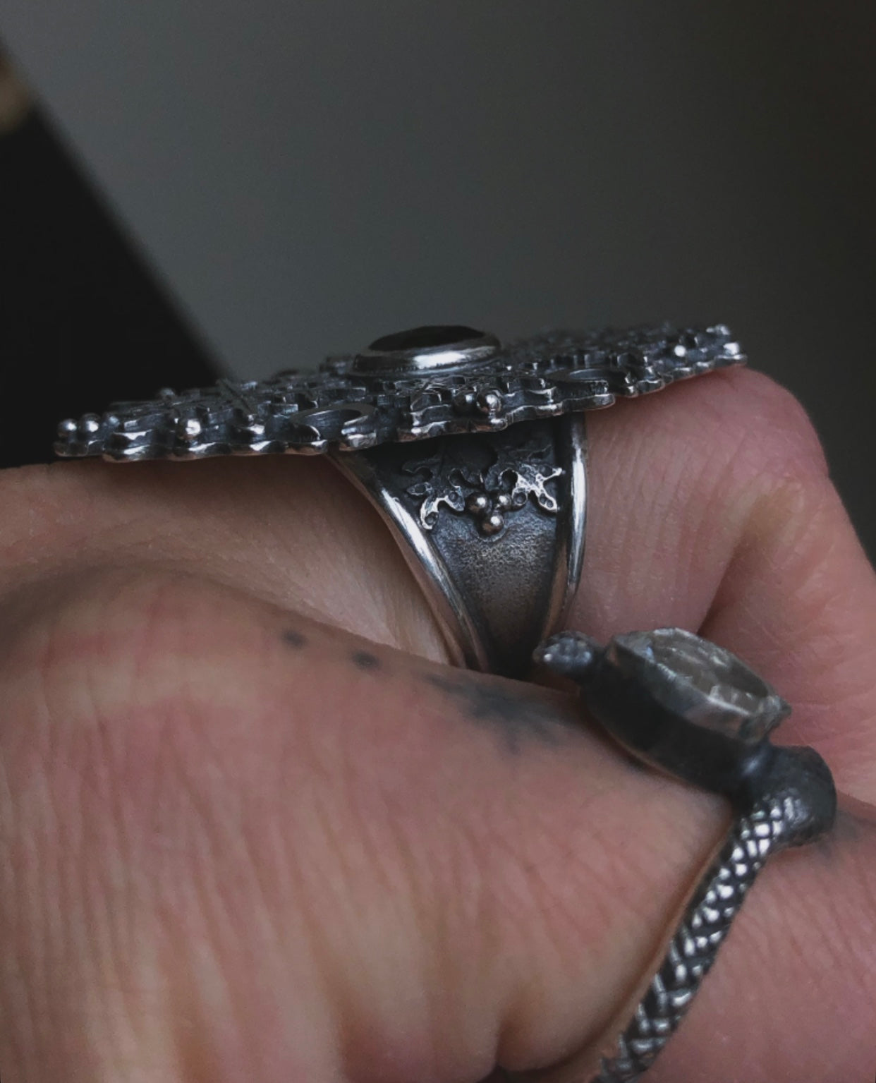 Will best fit a size 7, the ring face measures 1 3/4”. The band is tapered and shaped to fit comfortably. It has a small partial snowflake accent on each side. Oxidized and polished. Please allow 2-3 days for shipping.