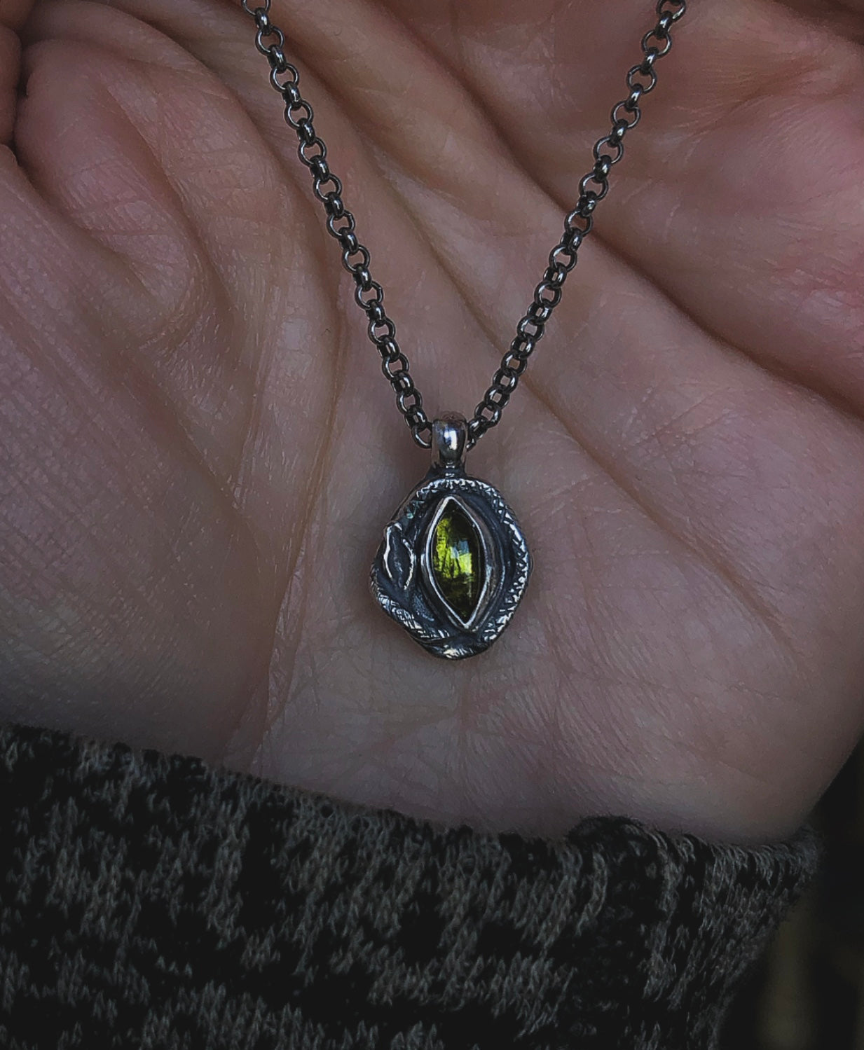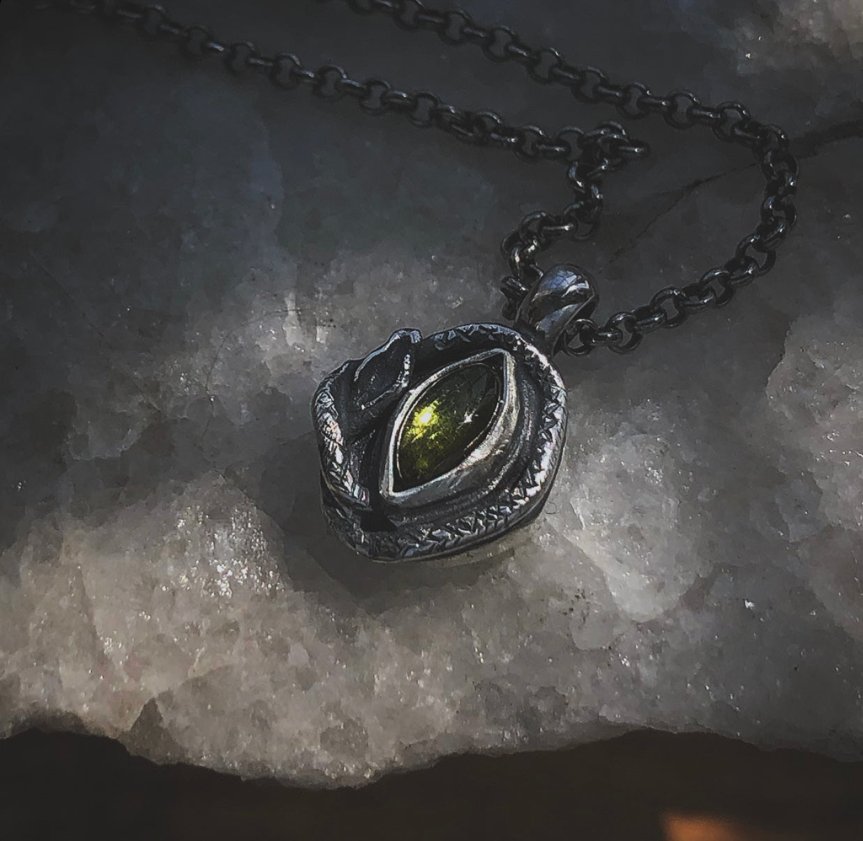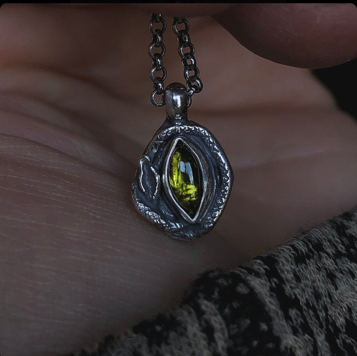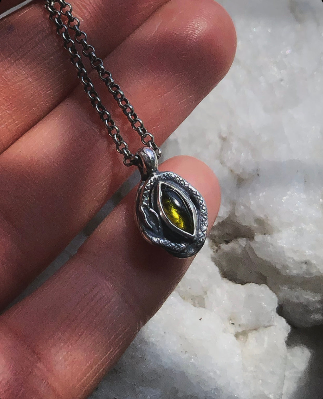 Sterling and fine silver mini snake eye relic charm. A yellow green *dark chartreuse* tourmaline ellipse eye centers encircled by a tiny serpent. Perfect for layering and daily wear! Little unearthed treasure! Measures about 3/8”. Sterling chain. Ships in 2-3 days.