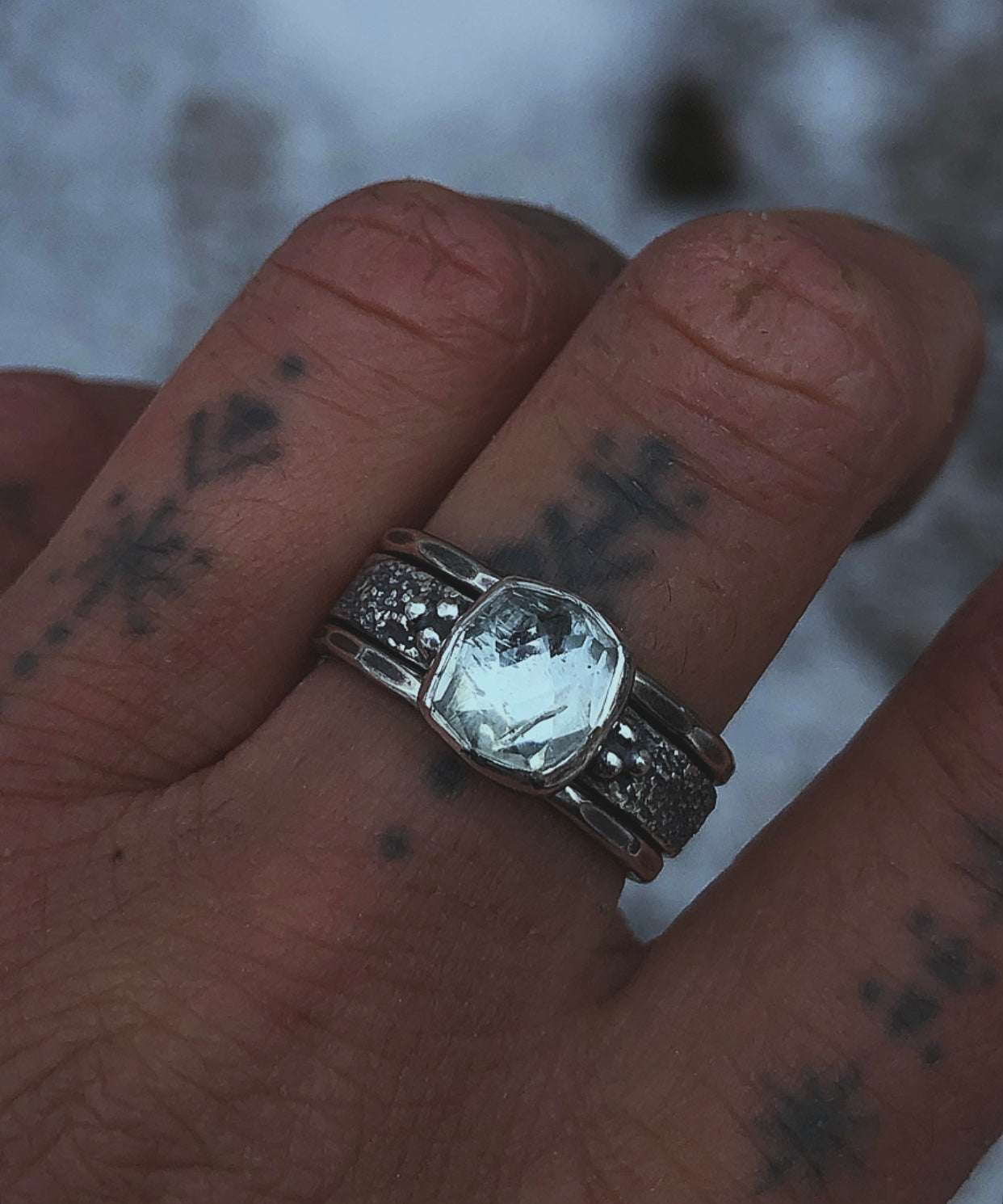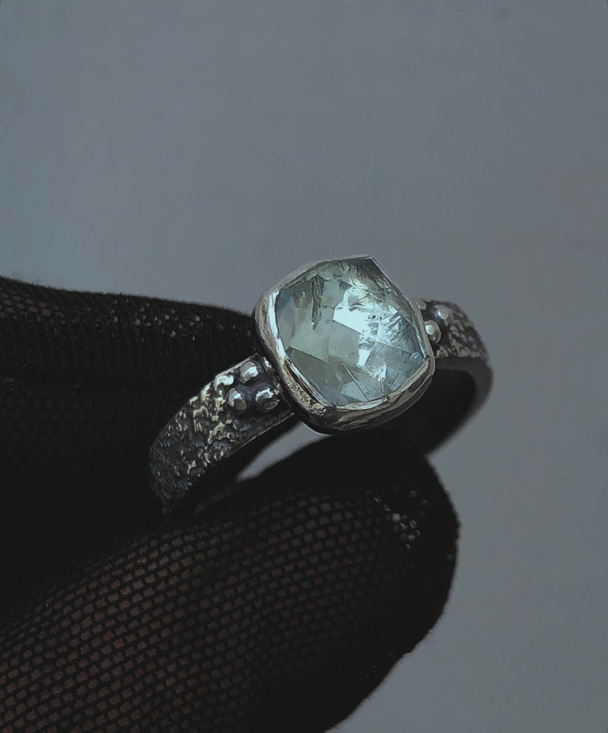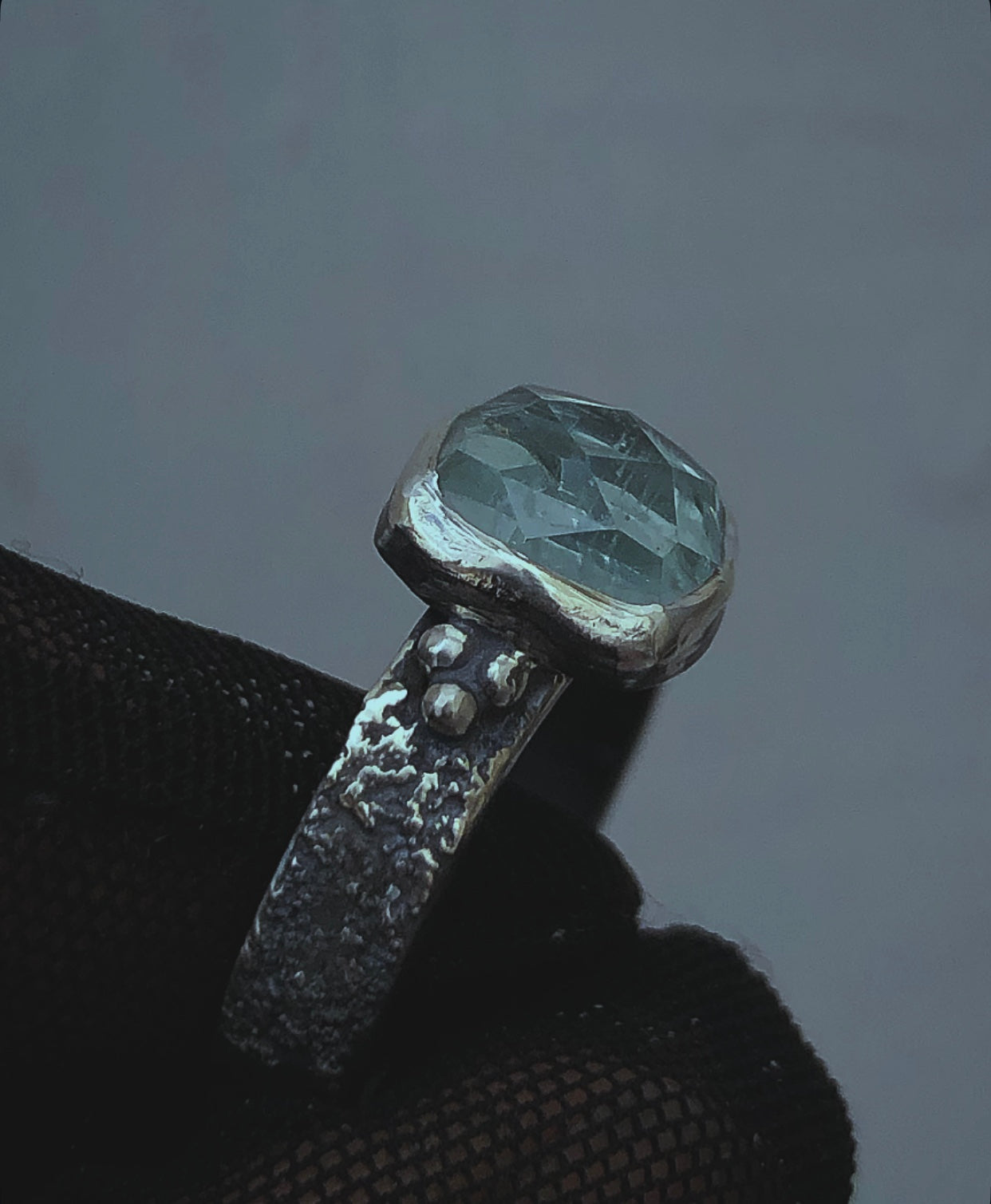 Sterling and fine silver handcrafted stacking ring with a icy light blue rose cut aquamarine set on a frosty snowscape band with bead detailed.