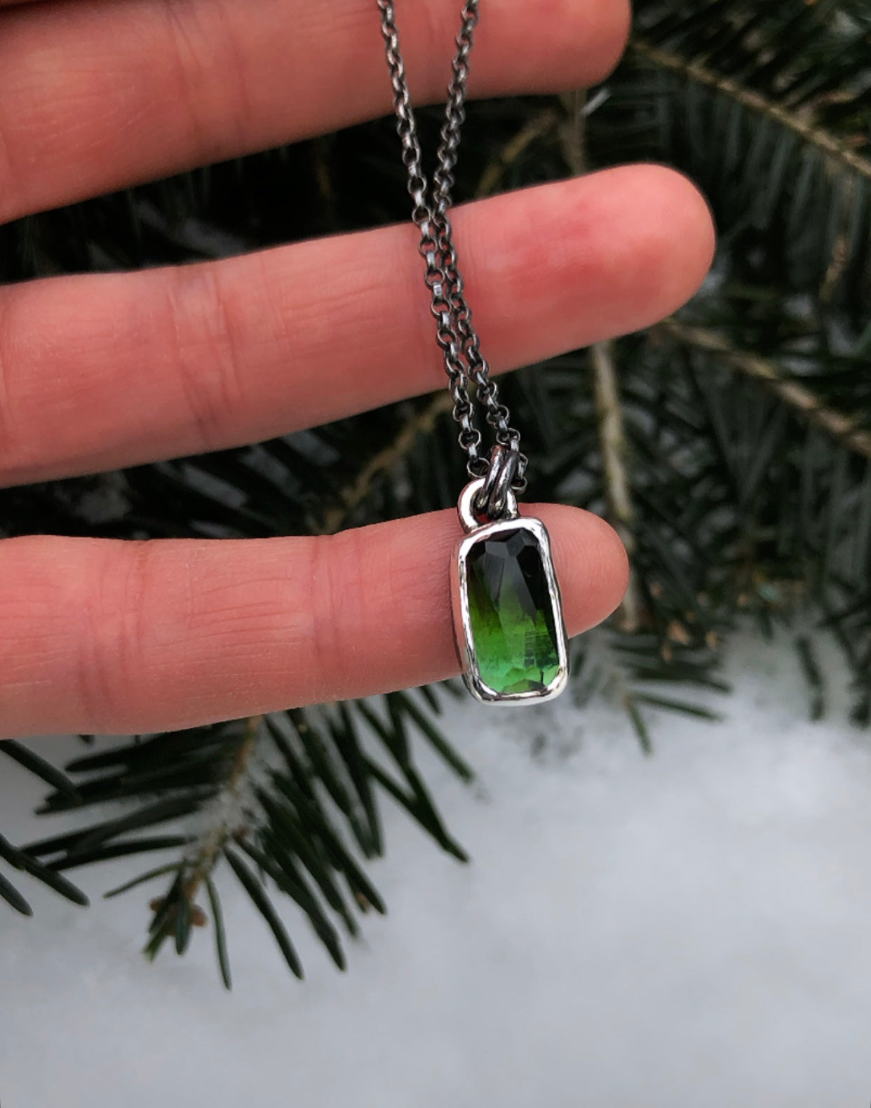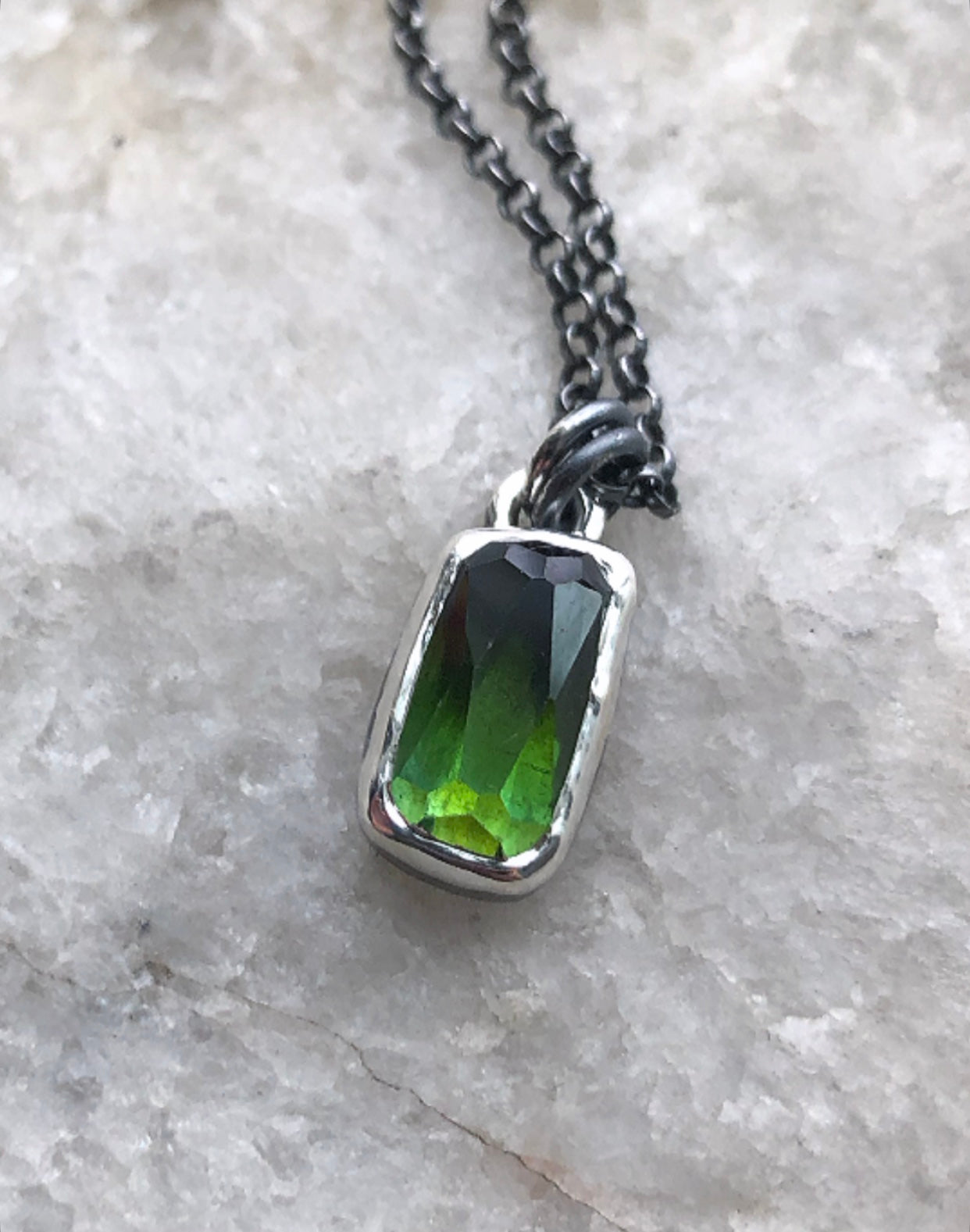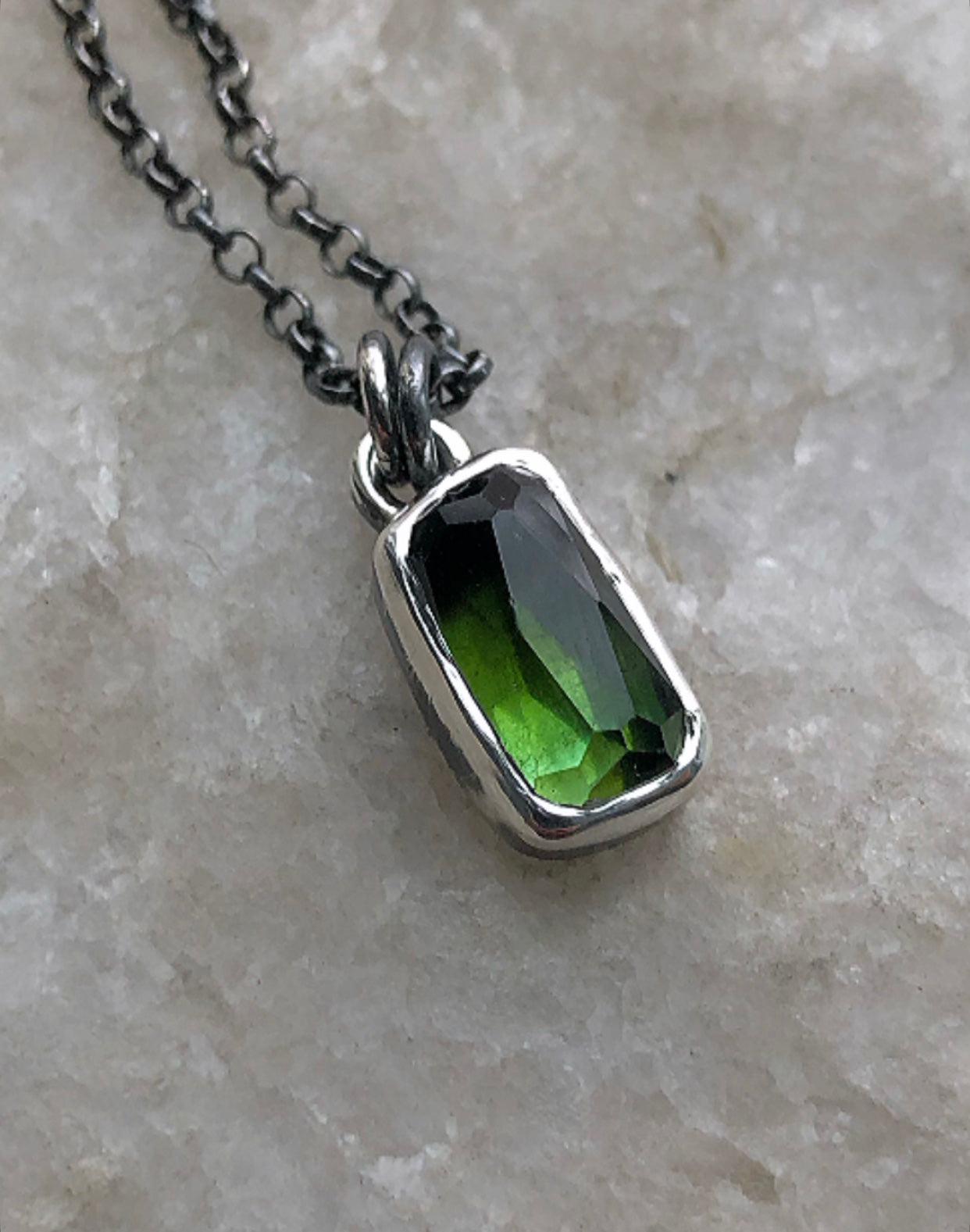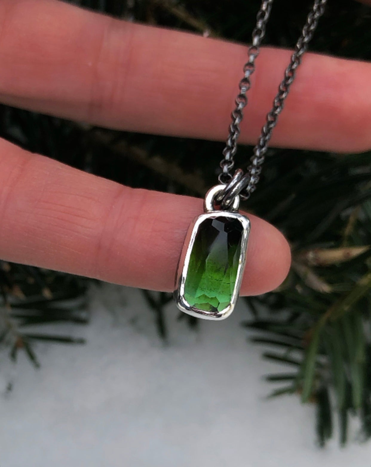 Handcrafted Sterling and fine silver charm. A bright ombre green tourmaline wrapped in bright silver. The color naturally graduates from a deep forest green tone to a brighter cedar green. Measures 3/4x 1/4”. Chain is Sterling 18”. Please allow 2-4 days for shipping.