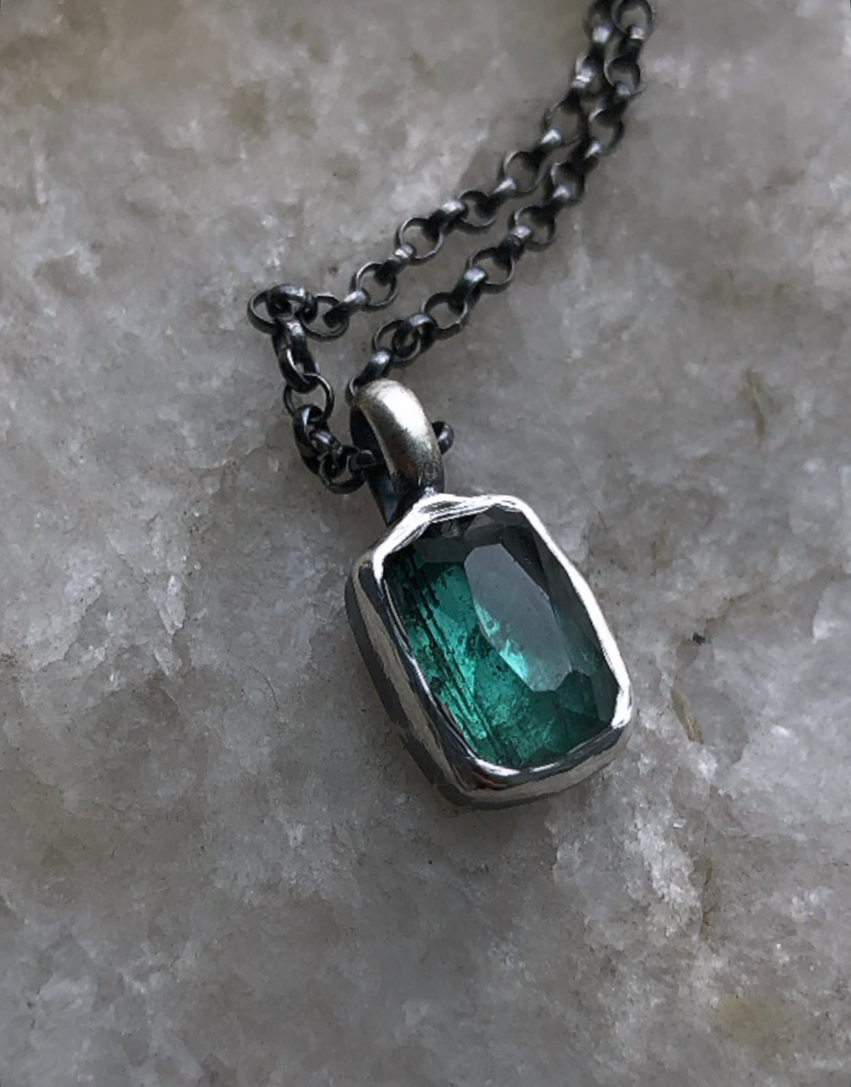 Handcrafted Sterling and fine silver charm. A bright blue green tourmaline wrapped in bright silver. The color reminds me of the moodier blue spruce trees. Measures 1/2”x 1/4”. Chain is Sterling 18”. Please allow 2-4 days for shipping.
