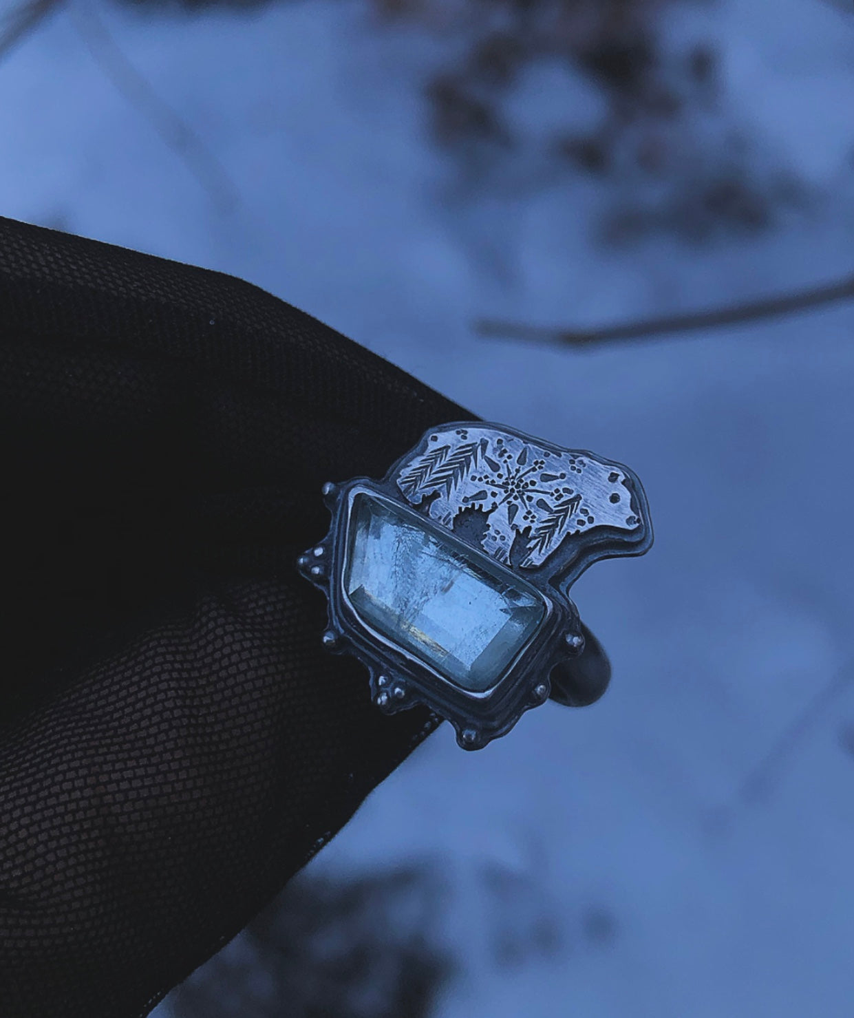 Handcrafted from Sterling and fine silver, a winter woodland bear lumbers quietly across a icy blue lake of aquamarine.