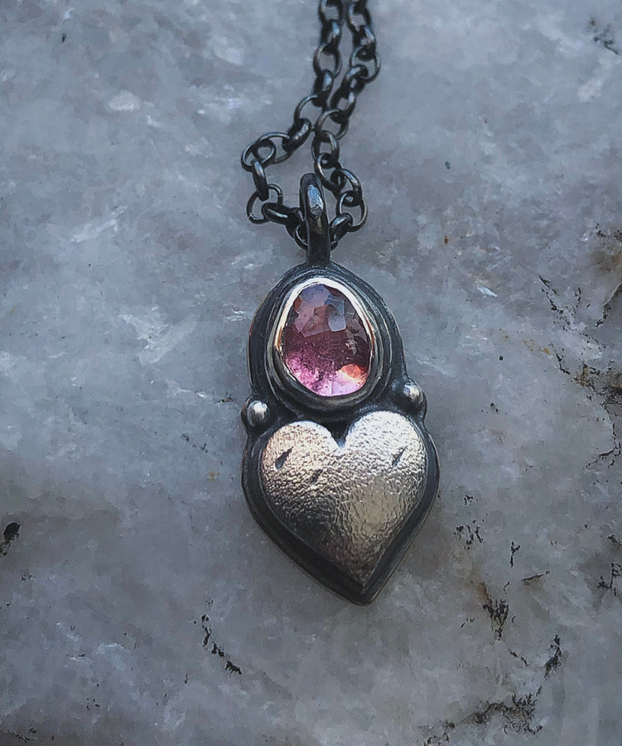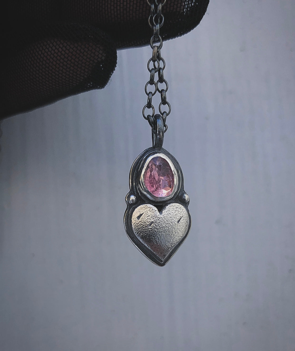 Sterling and fine silver handcrafted Lover’s Day charm necklace. With a light pink rose cut tourmaline, measuring about 1” with an 18” Sterling chain. Please follow 2-4 days shipping.