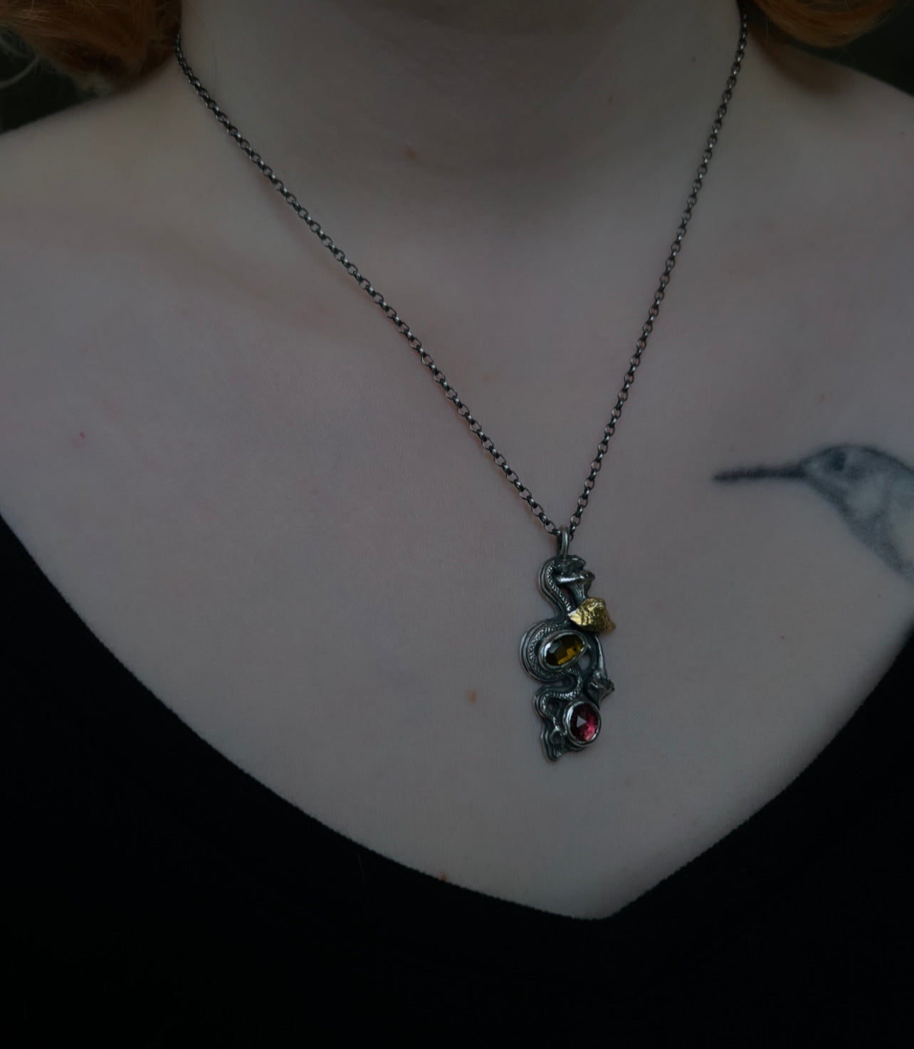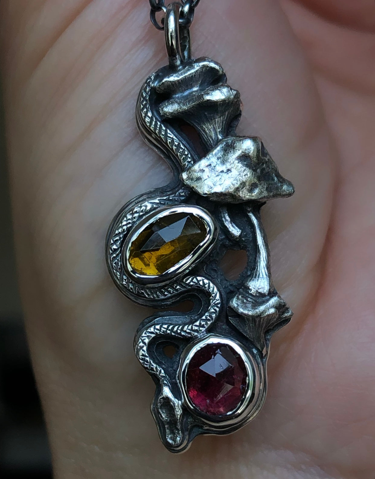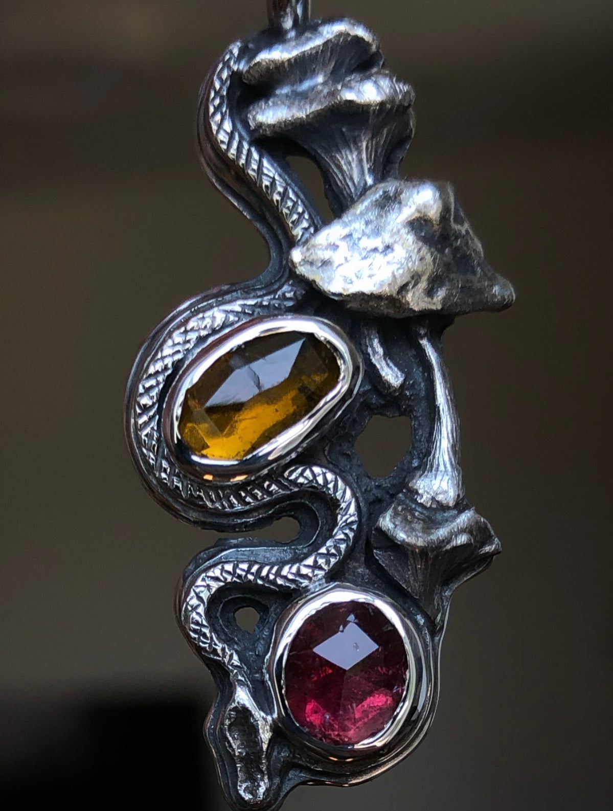 Handcrafted Sterling and fine silver pendant. Each mushroom has been handcrafted and textured along with the serpent. The two tourmaline stones rich hues of deep cranberry red pink and olive brown. The silver has been oxidized and polished with the mushrooms a ghostly matte silver.