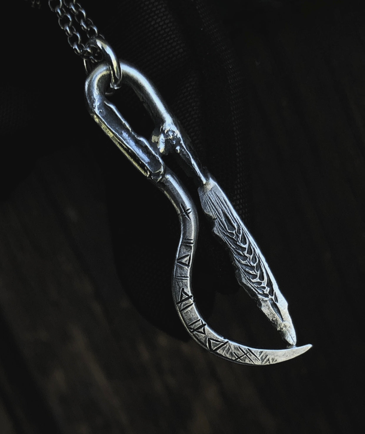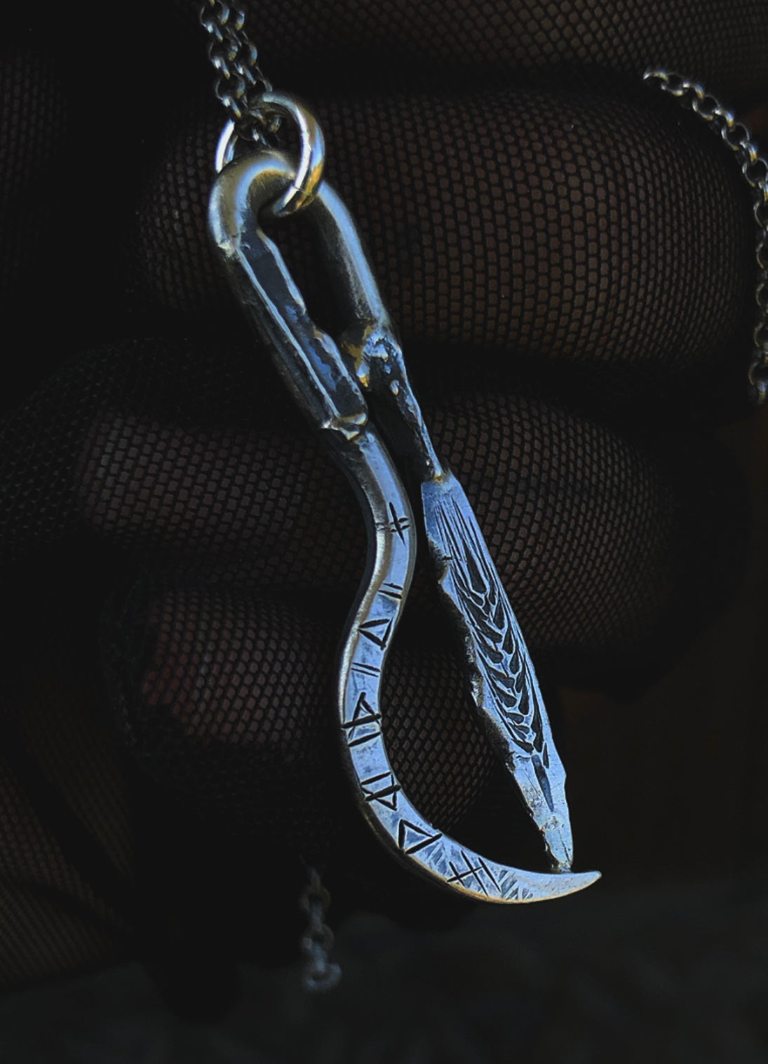 Handcrafted from Sterling silver, these charms are crafted with the ways of the old world in mind. The knife has a wheat spike etched into it and the scythe is accented with Wiccan symbols carved onto it as well.