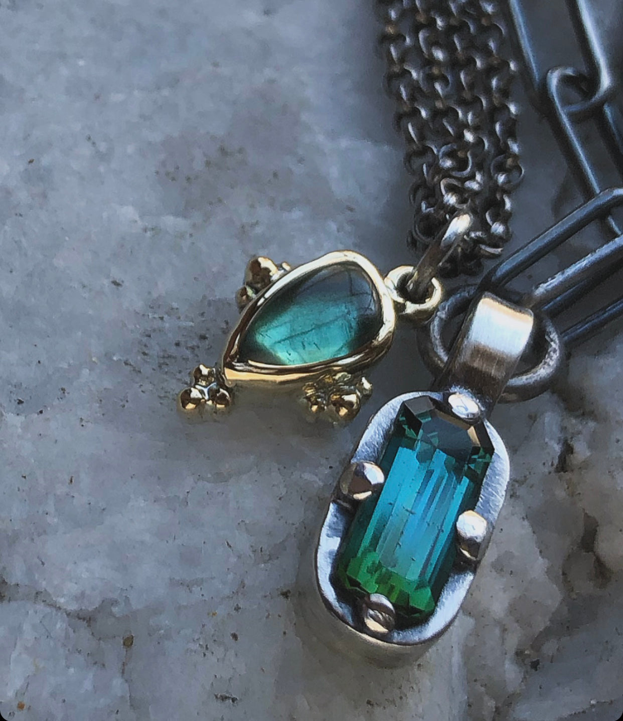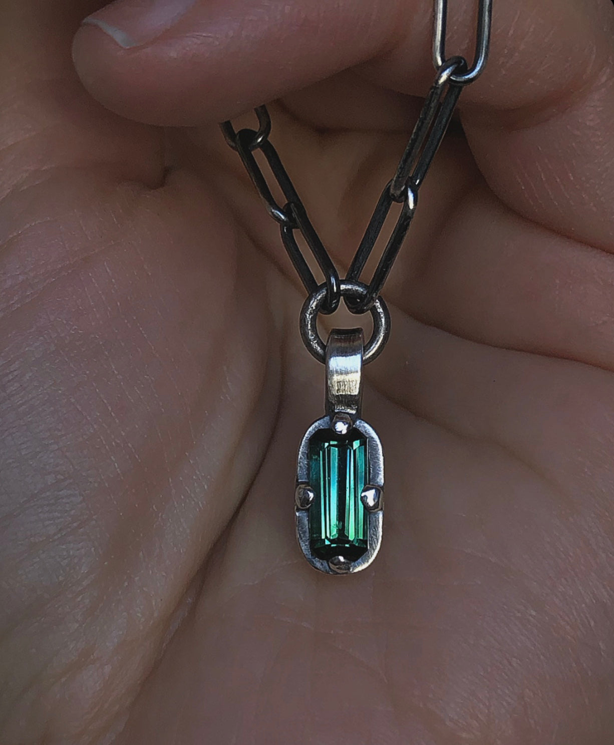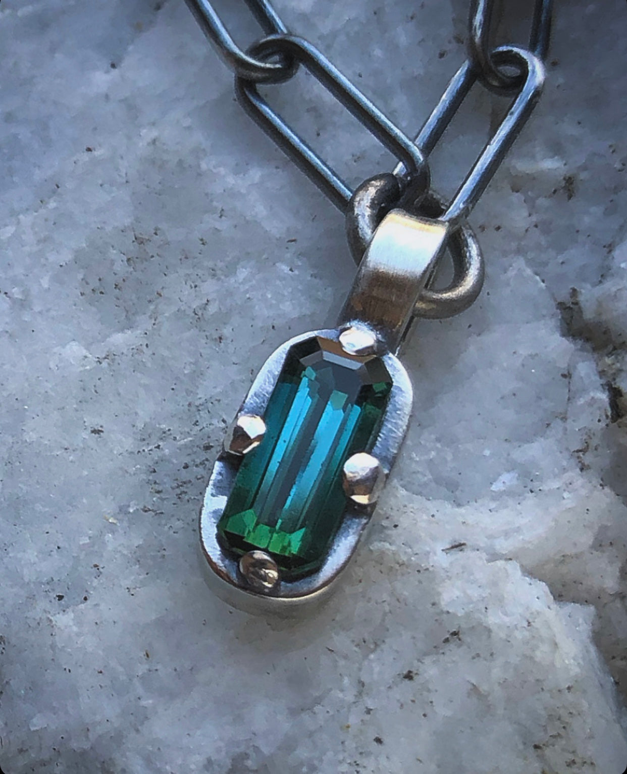 Handcrafted pendant set in Sterling and fine silver. The tourmaline is a beautiful faceted bicolor tourmaline that is teal and green. Open back to let all those good crystal vibes move through ✨ in some lighting the hues/colors of the stone is quite visible and radiant, but of course in other lighting settings it’s a deeper blue green