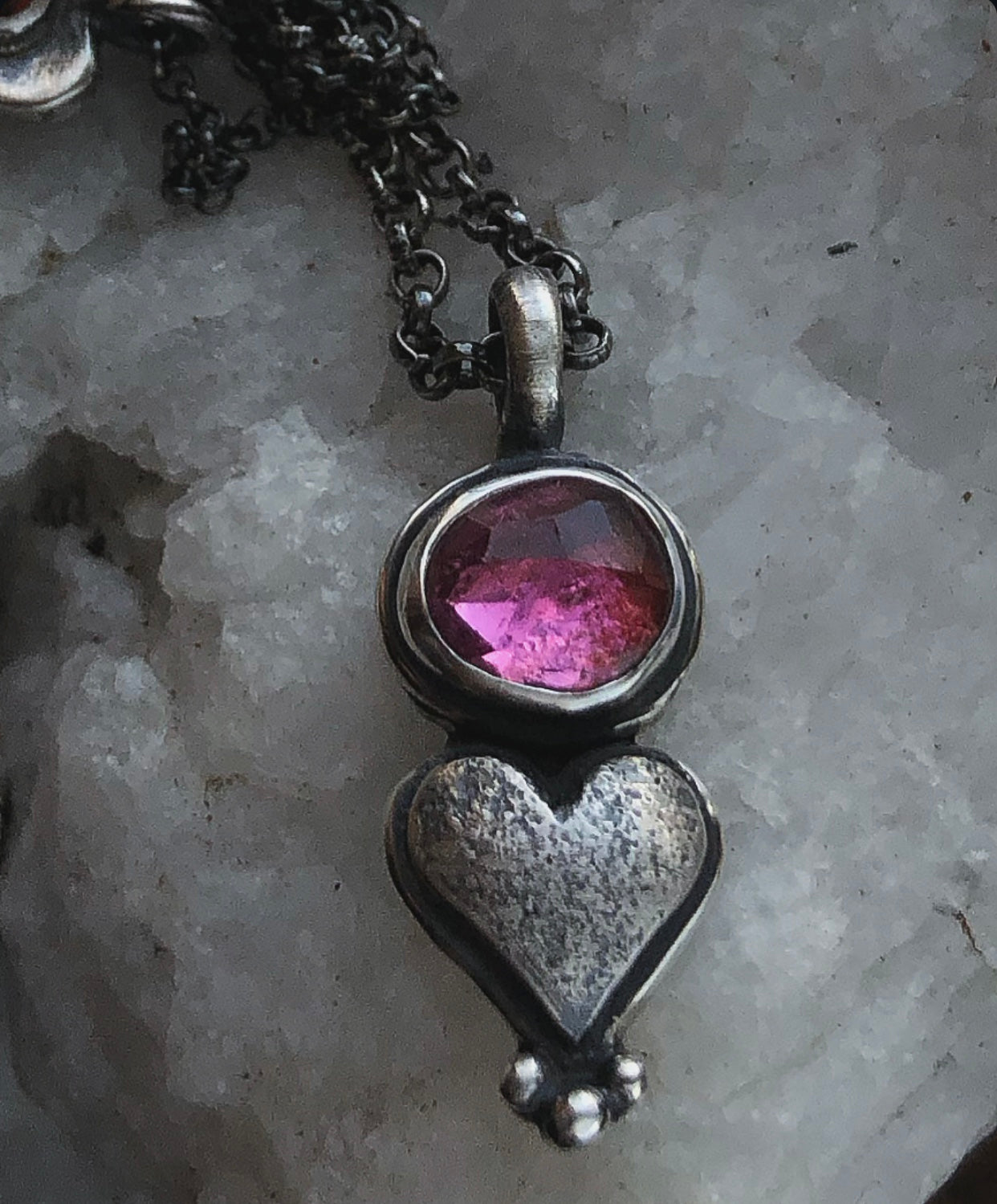 Tiny hot pink tourmaline heart pendant handcrafted from Sterling and fine silver. Perfect for layering and daily wear! The stone is a beautiful brightly saturated hot pink. Accented with a lightly textured heart. Measures about 1”. Will arrive on a Sterling 18” chain.