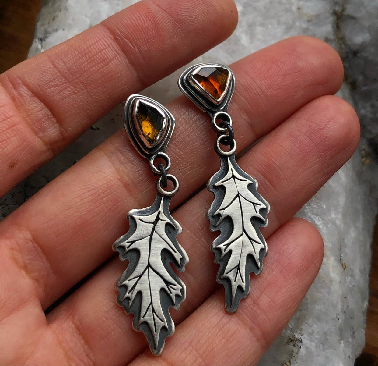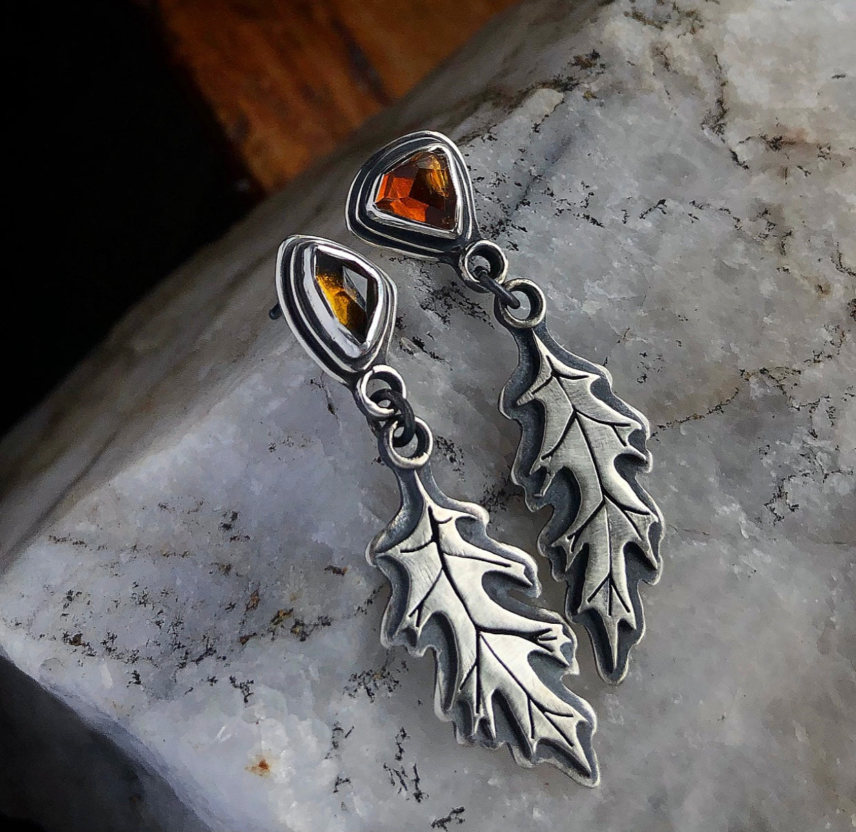 Handcrafted red oak leaves swing beneath two mismatch autumnal hued tourmalines. This pair measures at about a 1 3/4" drop. Oxidized and polished for depth and dimension.