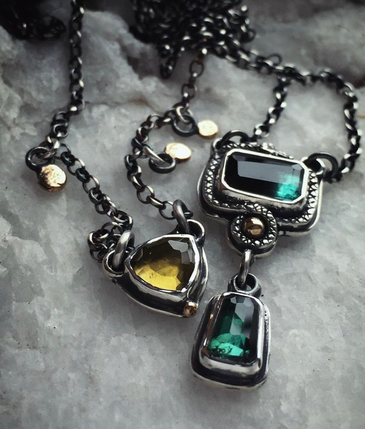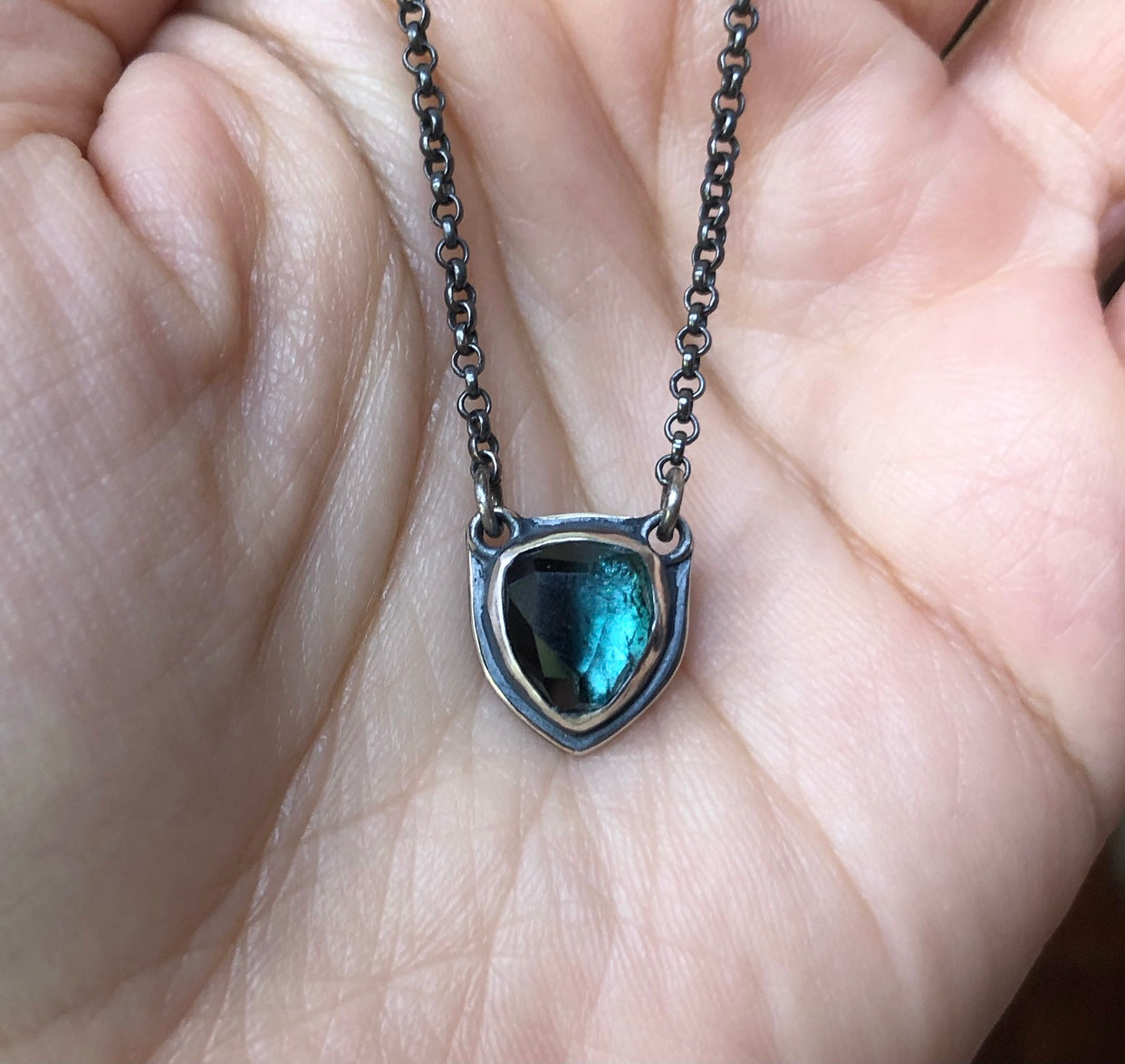 Handcrafted from Sterling and fine silver featuring a small custom cut bicolor tourmaline shield shaped stone in black and turquoise green/teal. Small and perfect for layering and daily wear.
