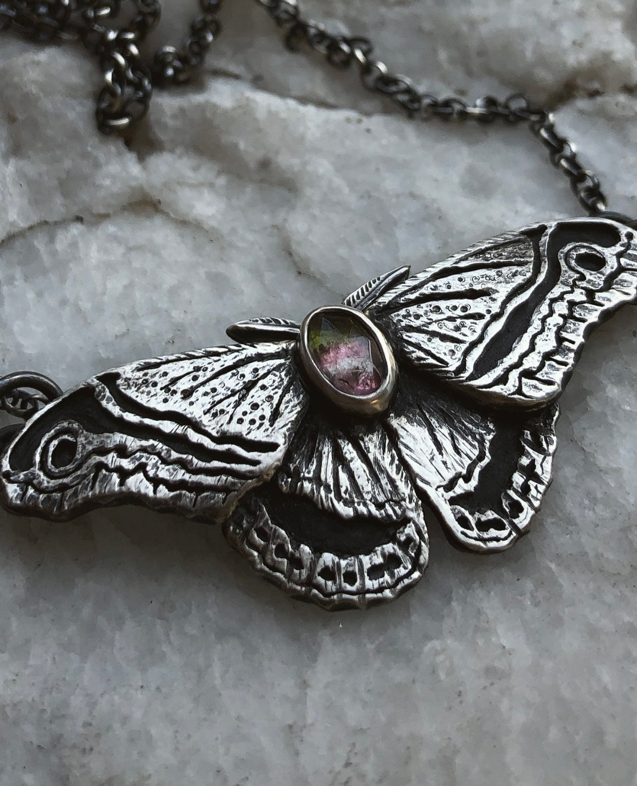 Handcrafted Sterling and fine silver moth with a unique pink blue and green tricolor tourmaline. Measures 2” across. Looks best work high on the neck so I have the chain shortened to 16” but can lengthen if you prefer. Lightweight and perfect for layering. Ships in 2-3 days.