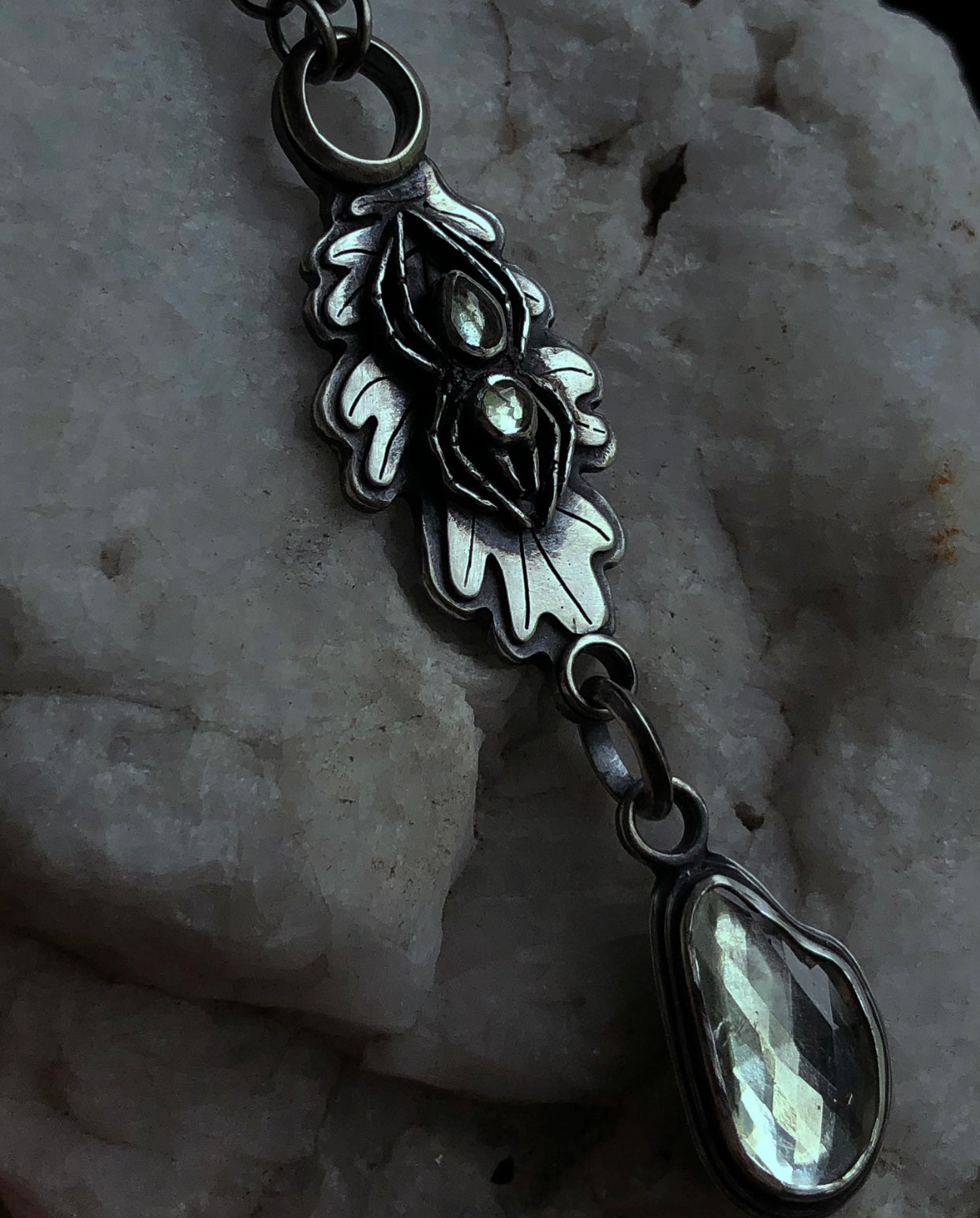 Handcrafted from Sterling and fine silver, this substantial long necklace has a silver spider resting on a big white oak leaf, it’s body eerie stones of an almost colorless tourmaline in what I call vapor hues. Slightly green and otherworldly. Beneath the leaf dangled a larger stone of the same vapor colorway.