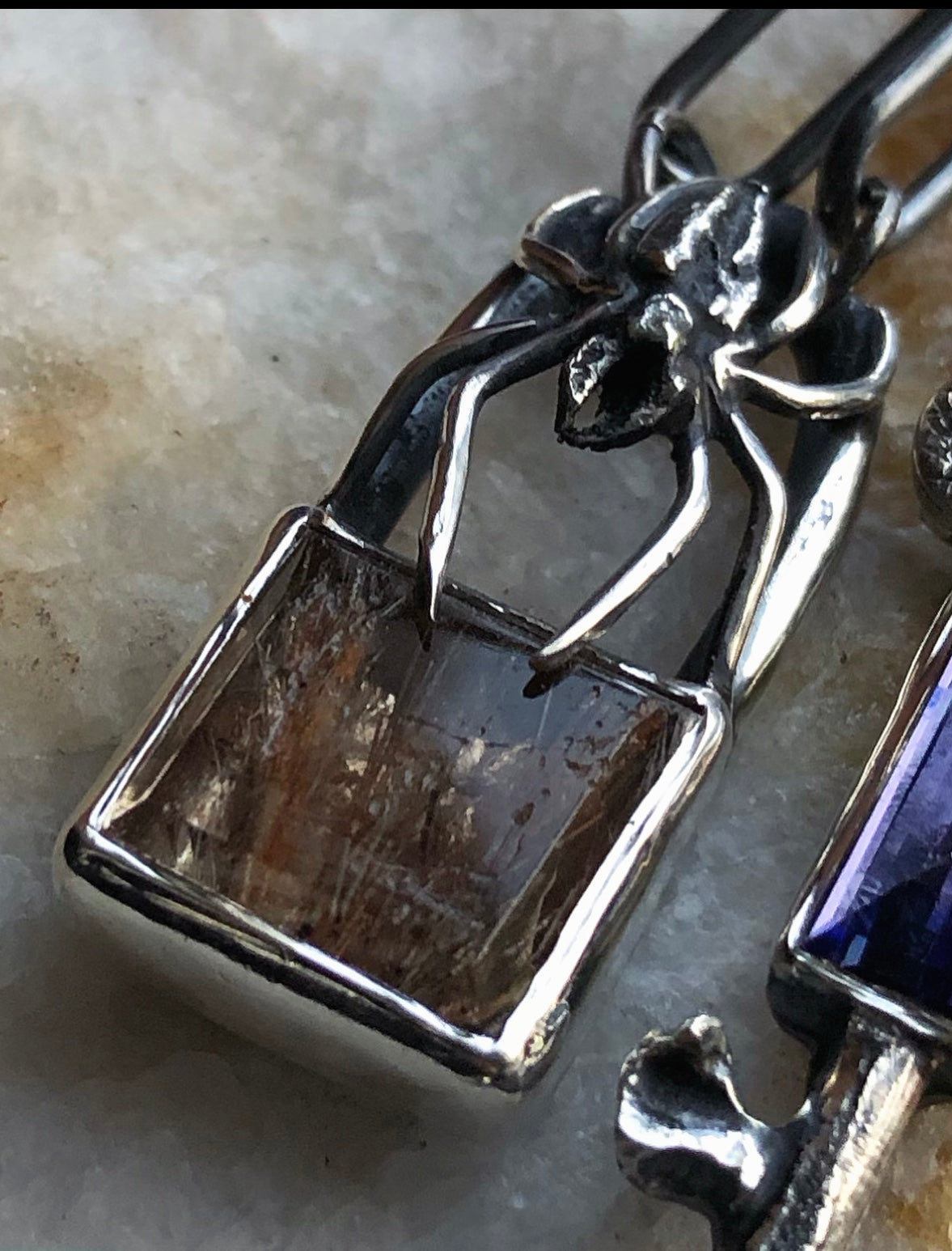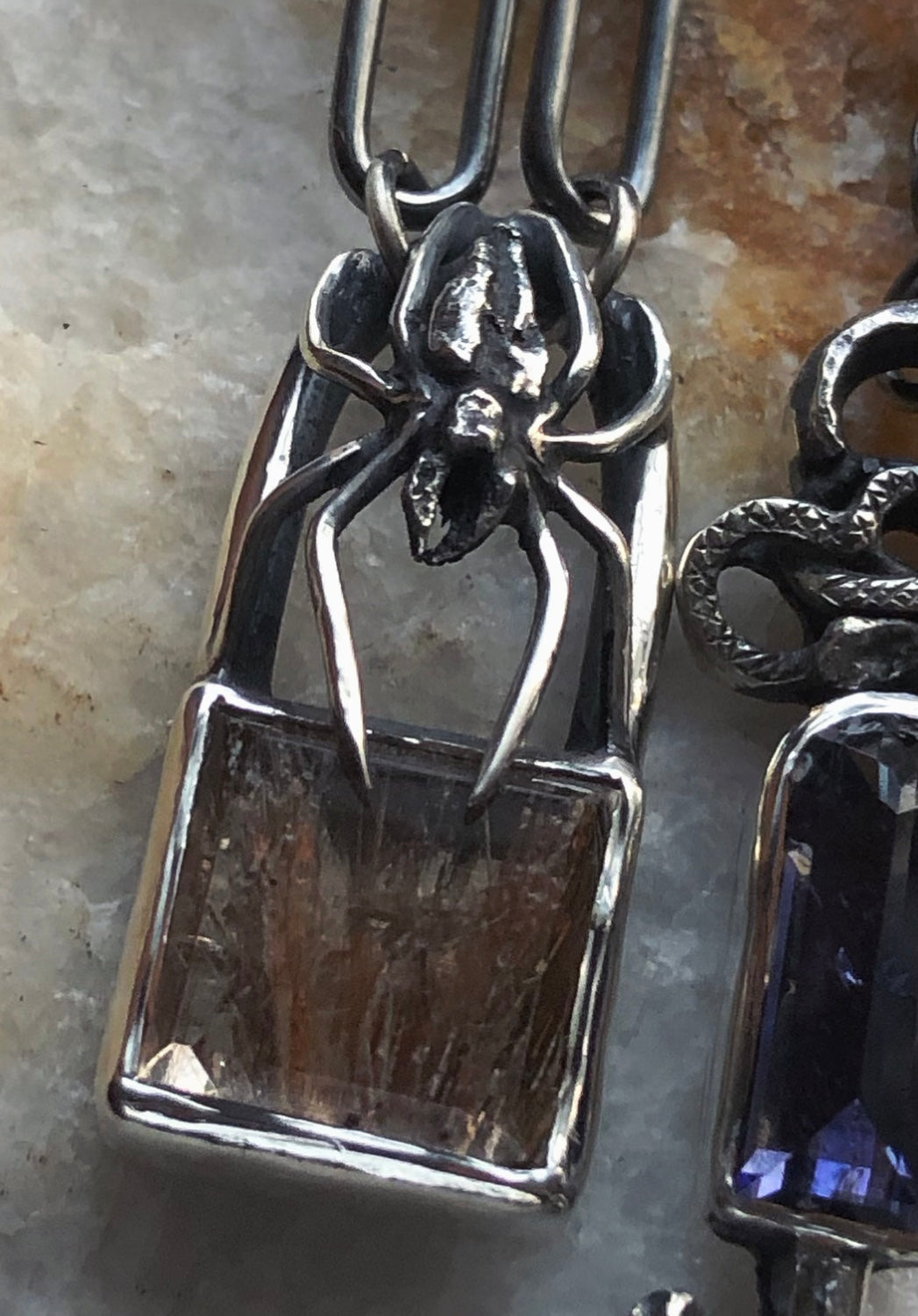 This small *non functioning* decor lock necklace features a unique and strange Venus hair Rutilated quartz stone encased in silver and clutched by a handcrafted Sterling spider.