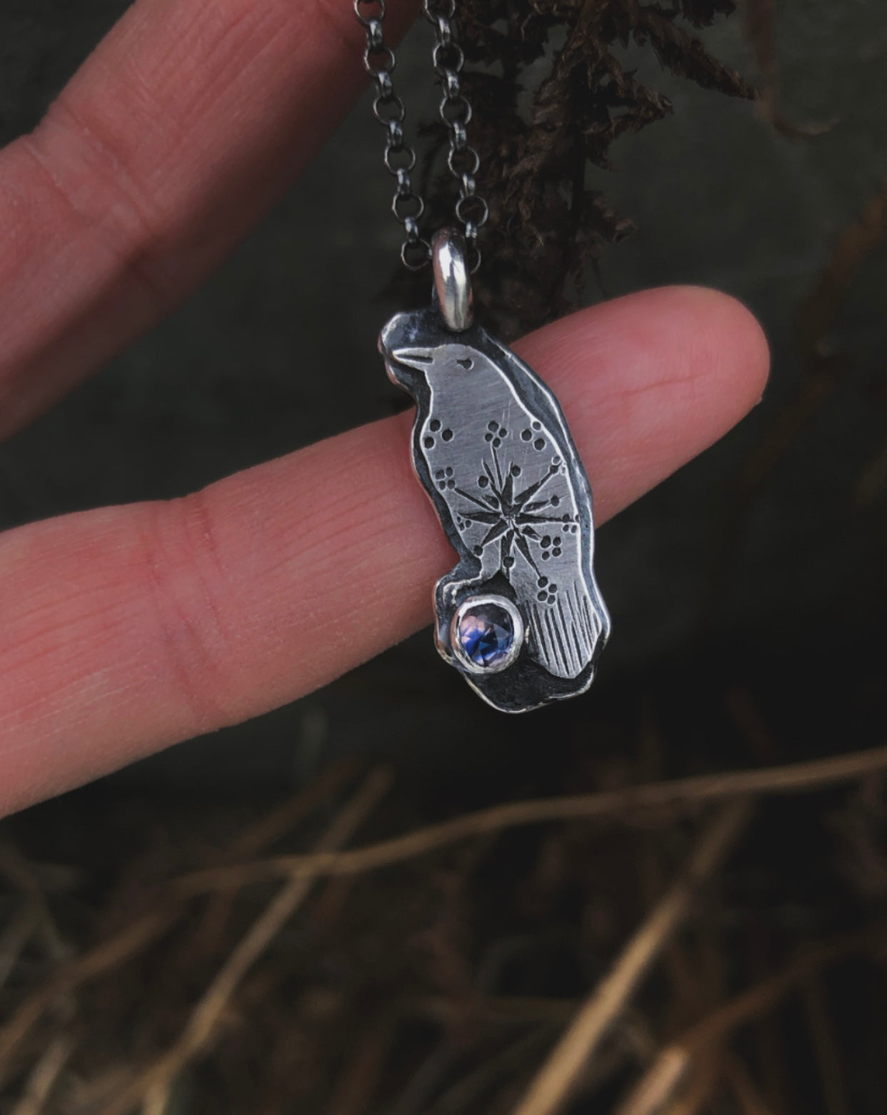 Handcrafted from Sterling and fine silver, a white raven with snowscape Sigils clutches multi hued natural winza sapphire. The stone has a clear to pink coloring with blue throughout.