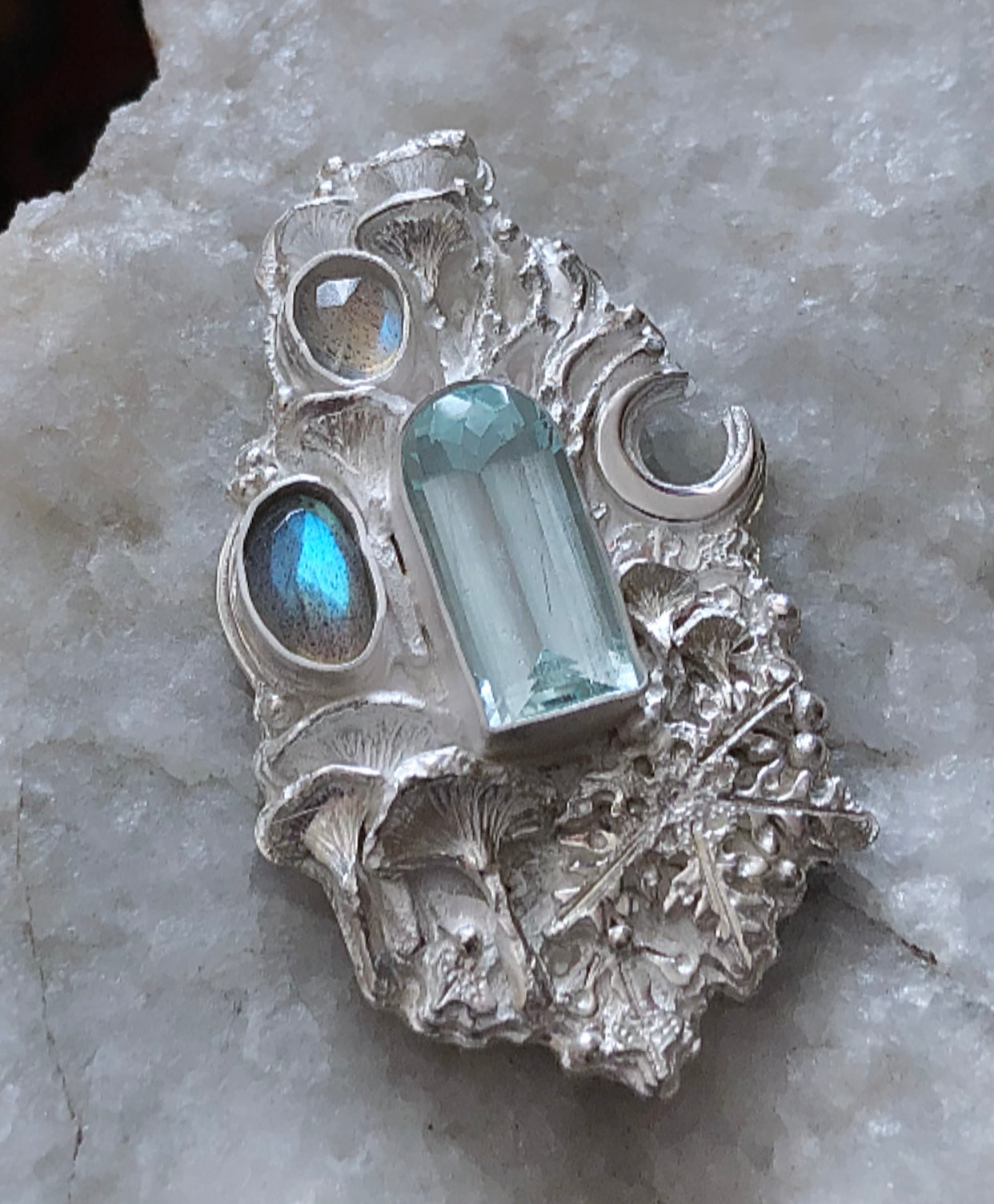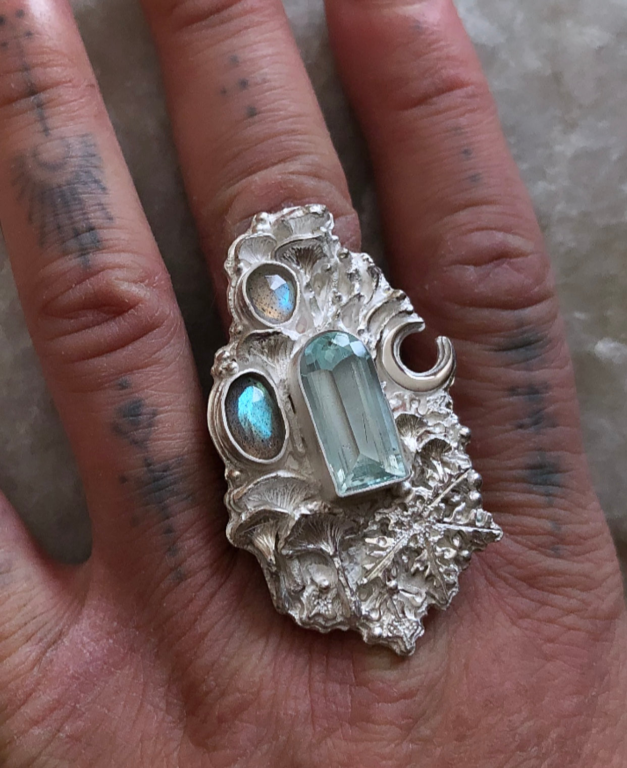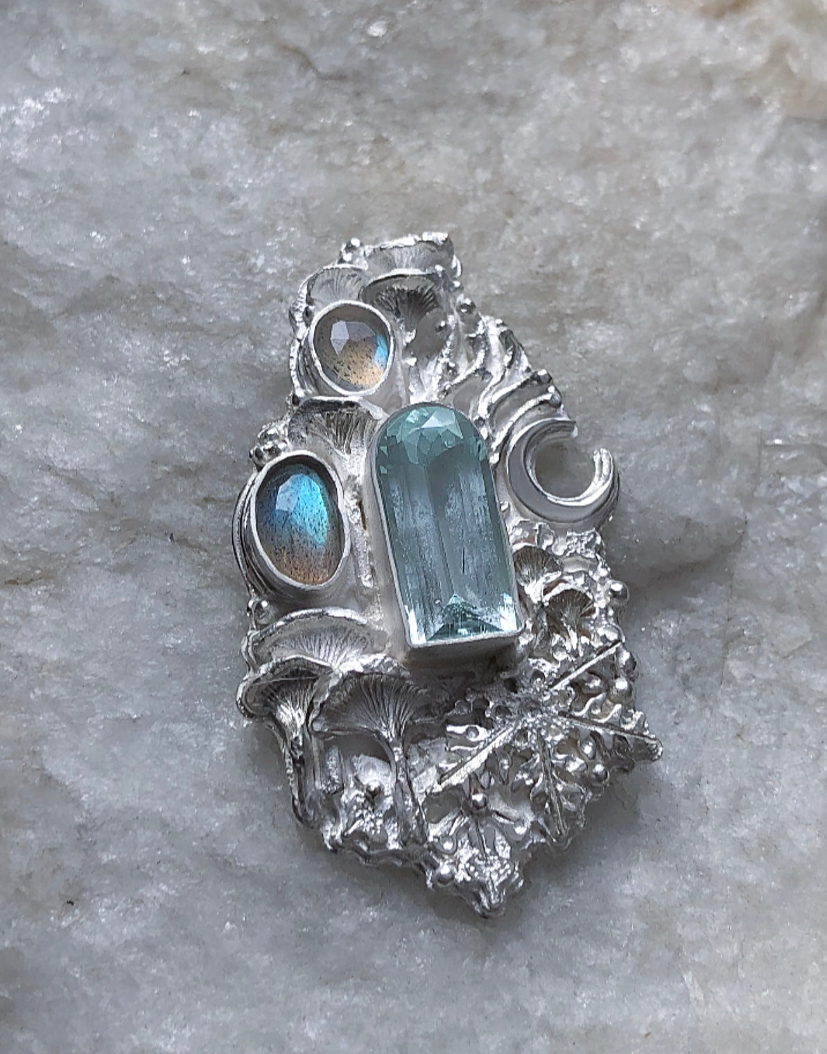 This handcrafted wintery woodland portal is comprised of handmade mushrooms, twigs and snowflakes resting around a natural icy blue Aquamarine portal stone (custom cut for my shop❄️) and natural labradorite with beautiful blue green flash.