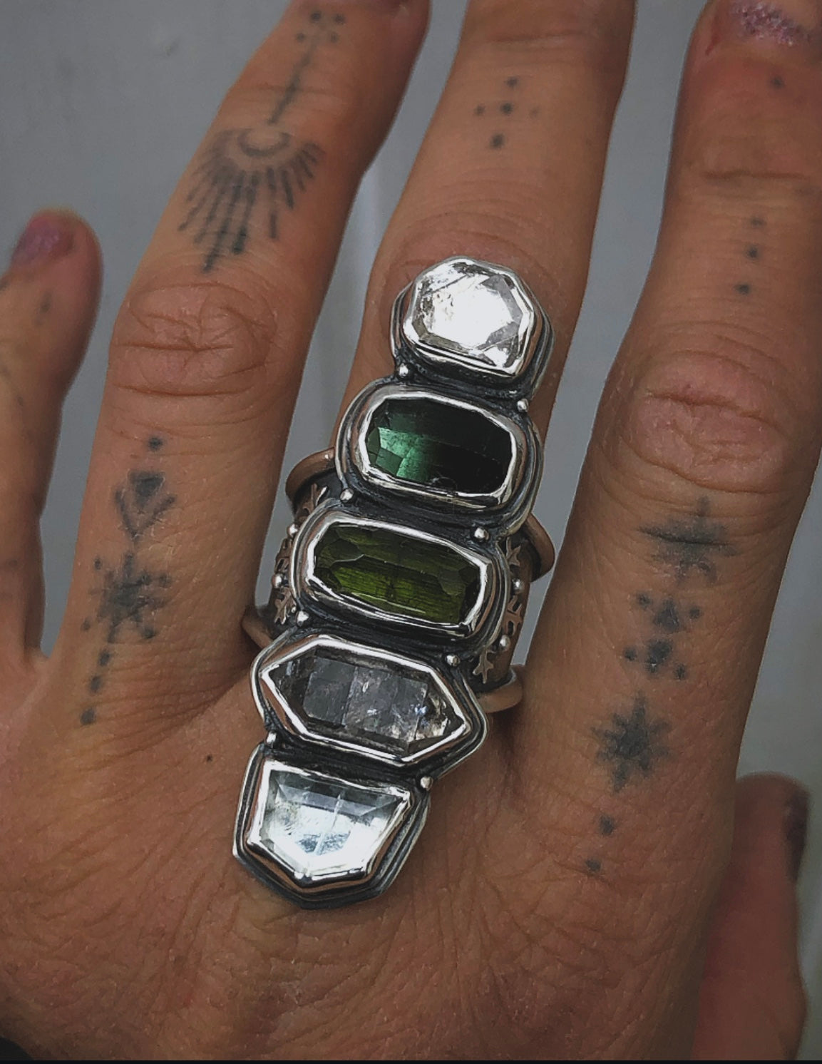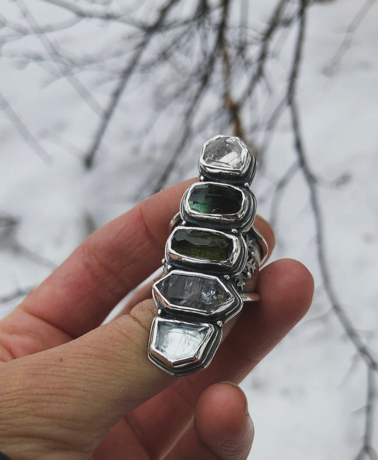 Sterling + fine silver ode to the colors and textures of the forest and mountains. The stones are aquamarine, quartz and tourmaline, each set above the other to resemble a stone cairn. Which have been used by hikers to help navigate trails for centuries.