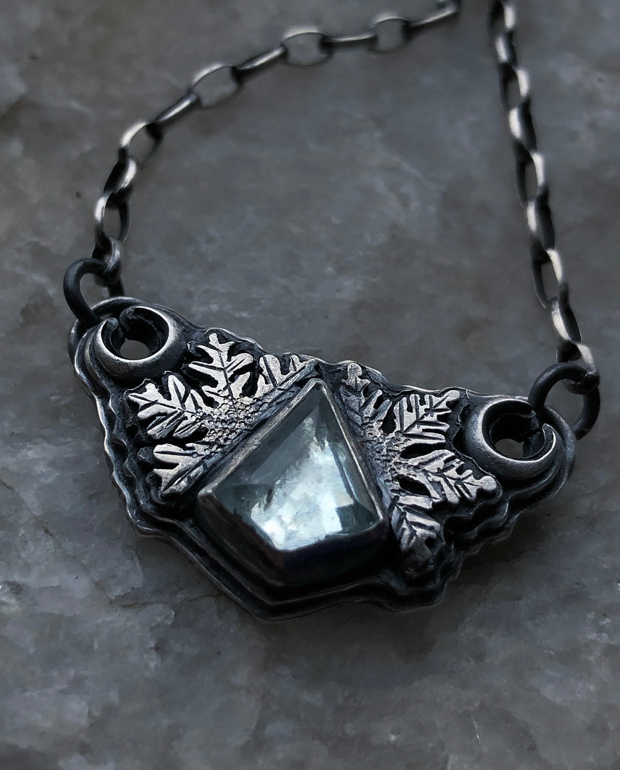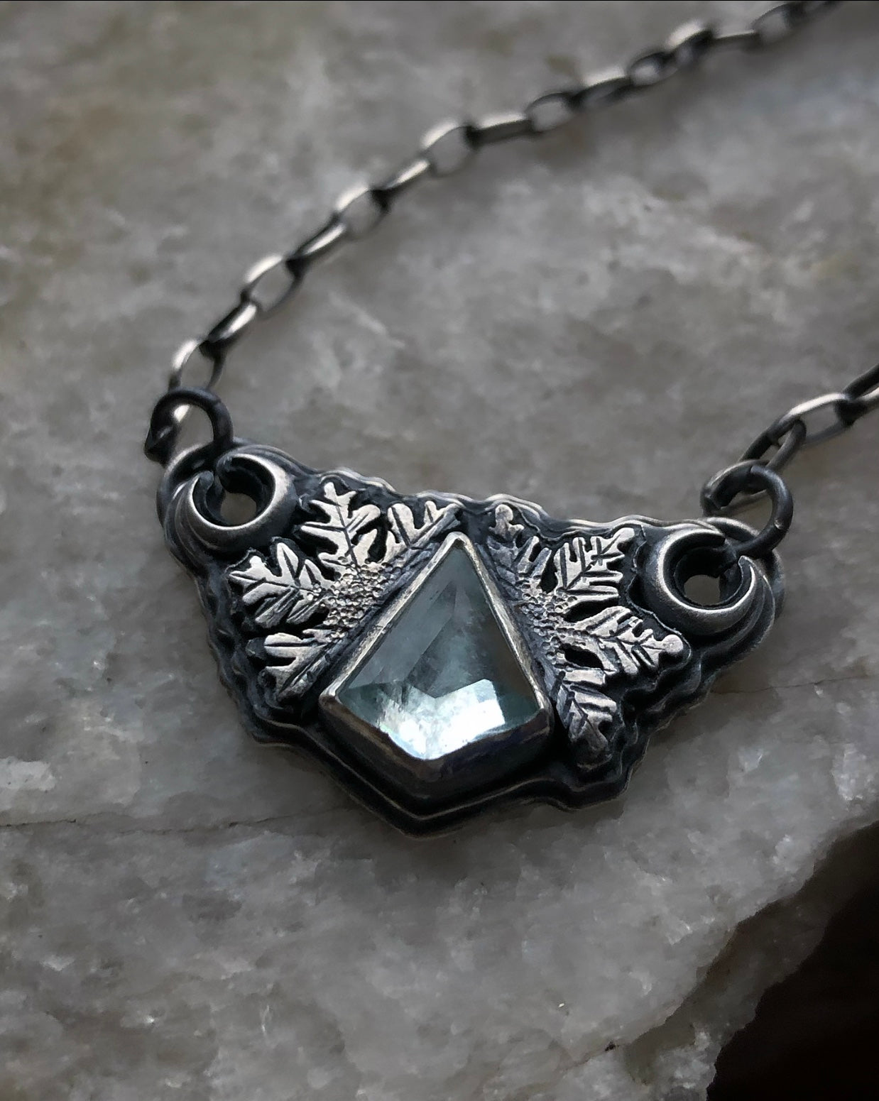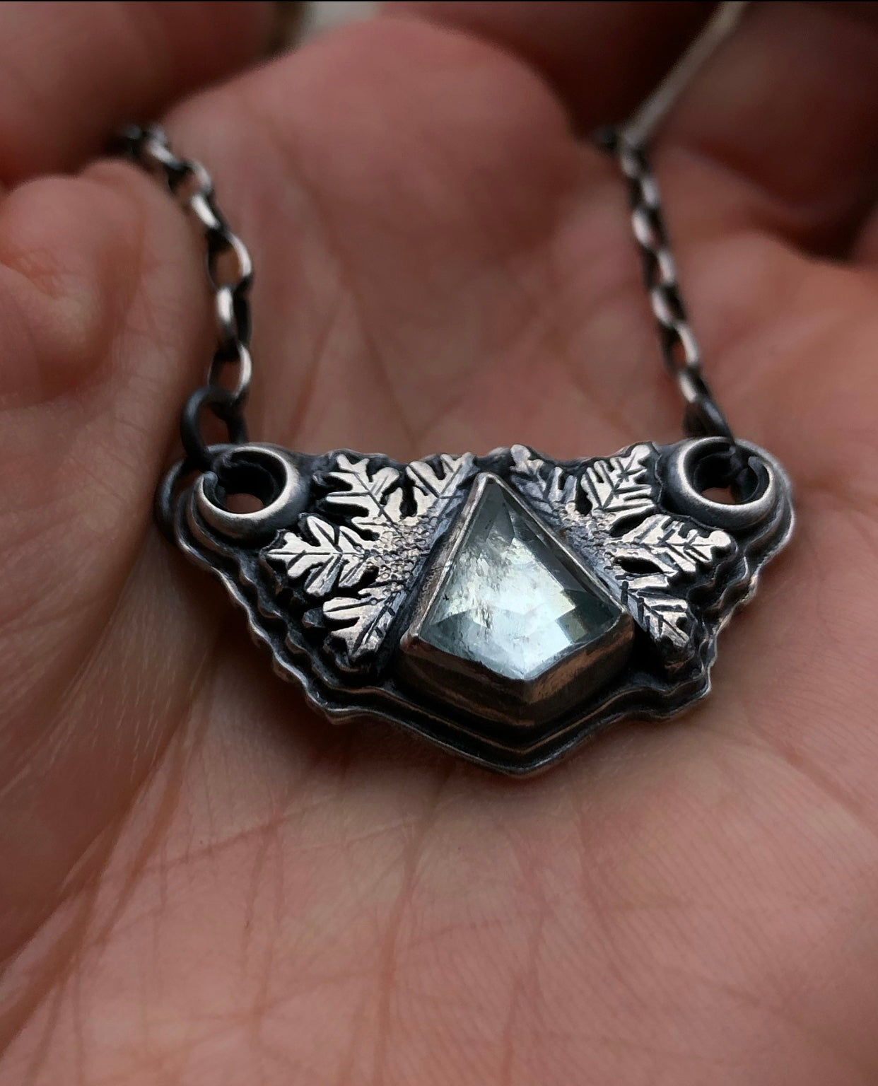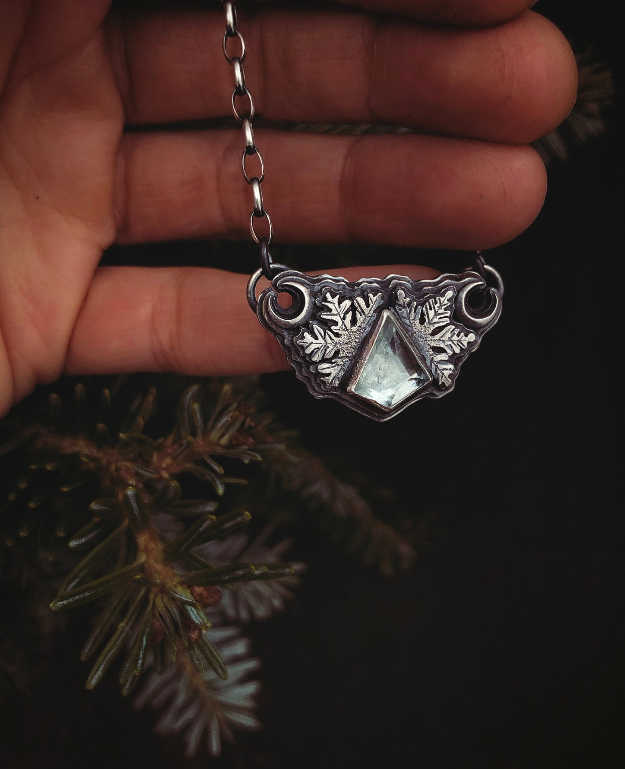 Handcrafted from Sterling and fine silver, this necklace features a shard like cut of aquamarine set between snowflakes and crescents. It has a unique horned animal like structure to it.